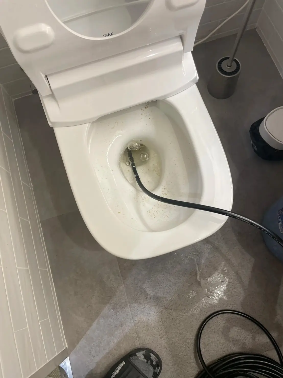 現場確認を行ったところ、便器内に汚水が滞留し、通常のローポンプ作業のみでは逆流のリスクが高かったため、溢れ防止として汚水の汲み取り作業から実施いたしました。