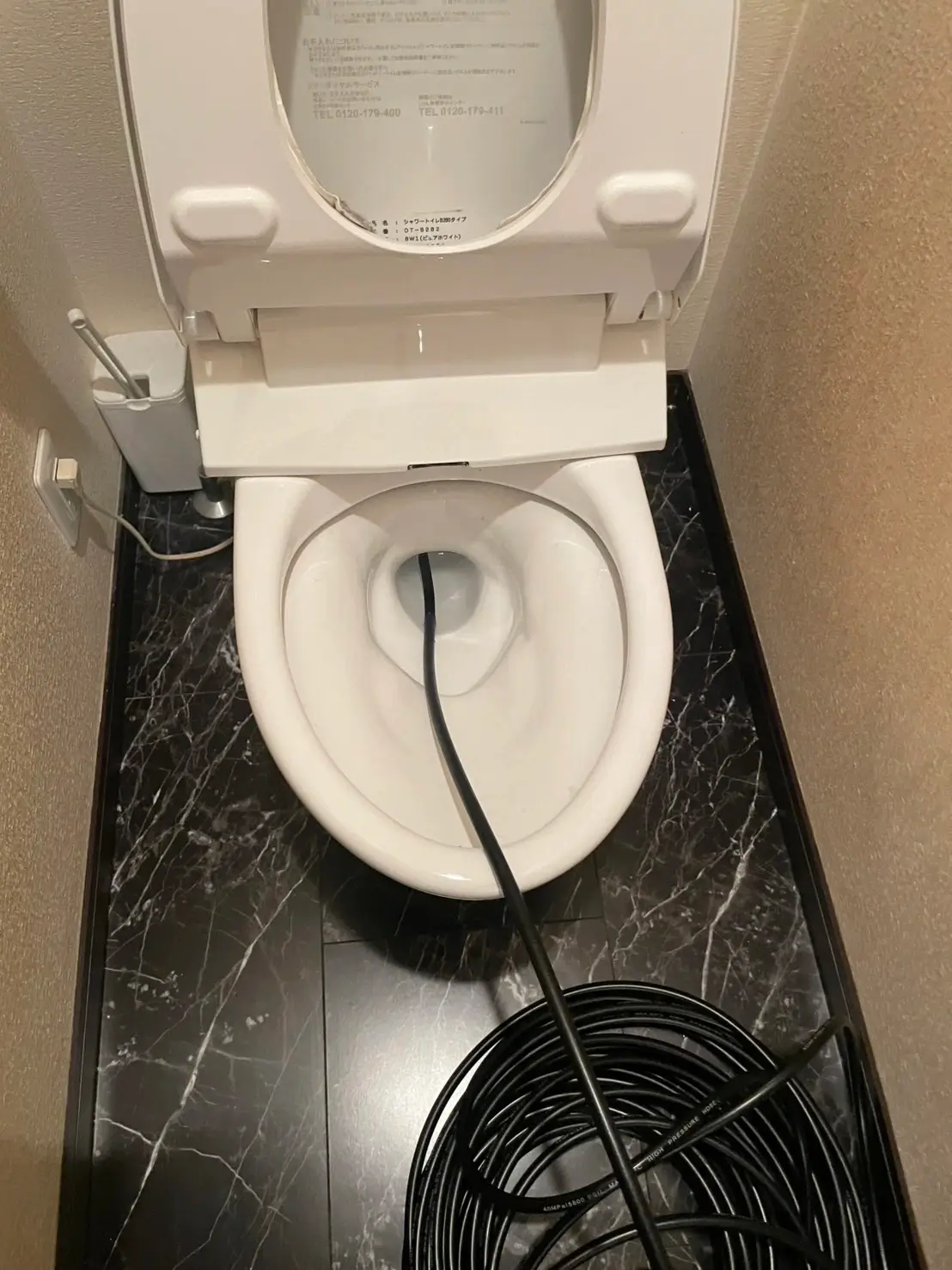 お伺いした際、トイレ排水の流れが極端に悪く、内部で水位が上がる症状を確認しました。
