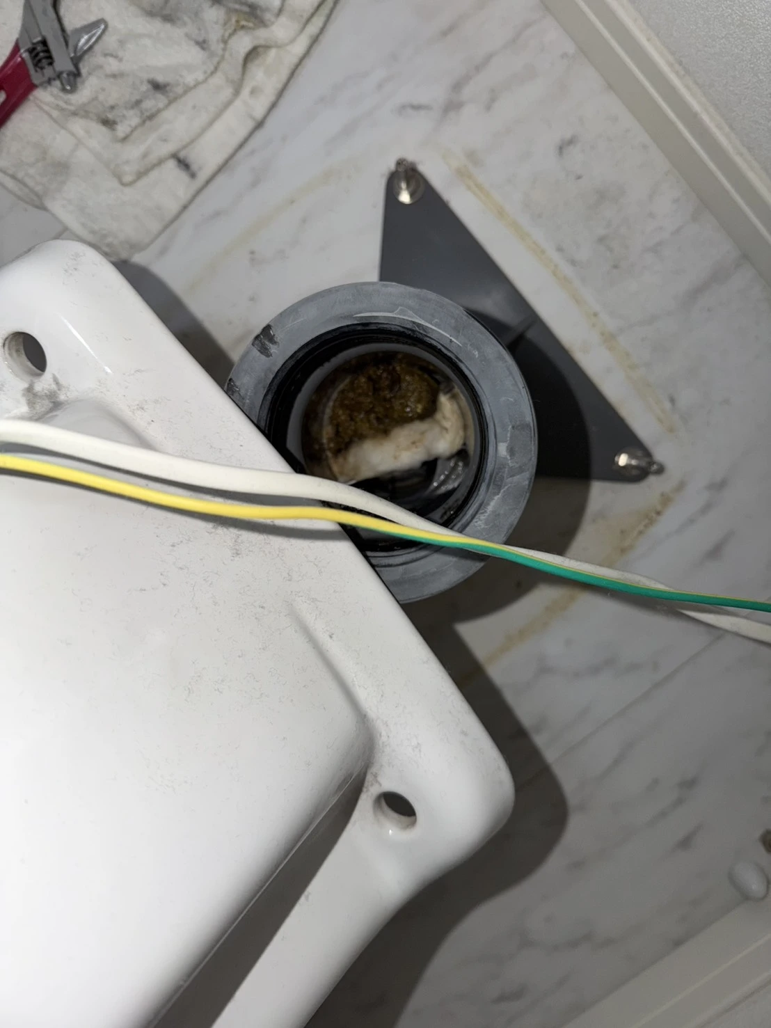 詰まりの位置が深く、異物混入の可能性もあったため、便器を一度脱着して内部の状態を確認いたしました。